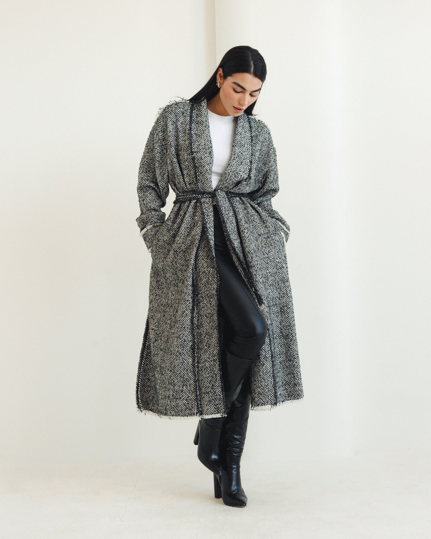 A statement tweed coat crafted from textured herringbone fabric, designed in a relaxed one-size silhouette that balances structure and ease. Featuring a self-tie belt to define the waist, front pockets for everyday practicality, and subtle raw-edge detailing that adds a modern, effortless finish, this mid-length coat is perfect for layering and elevating both casual and refined winter looks