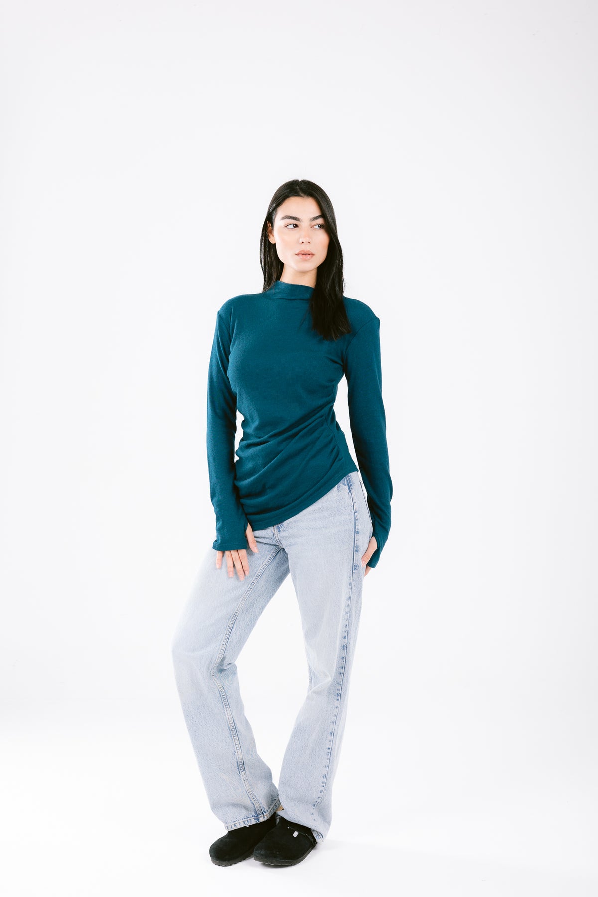 A sleek, soft-knit draped top designed to elevate your everyday basics. Made from an ultra-soft, stretchy knit that hugs the body beautifully and gives a sculpted, flattering shape. The high neckline adds a clean, modern feel, while the subtle draping and thumb-hole sleeves give it that chic, elevated touch. It’s a basic — but done in a cooler, more polished way.