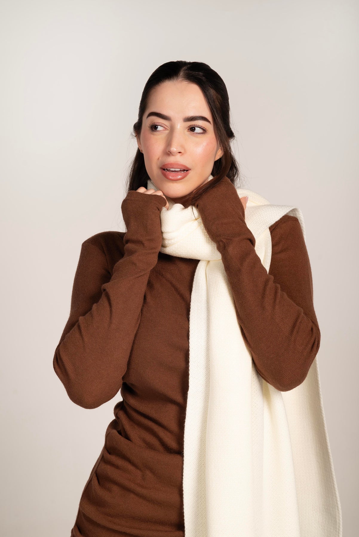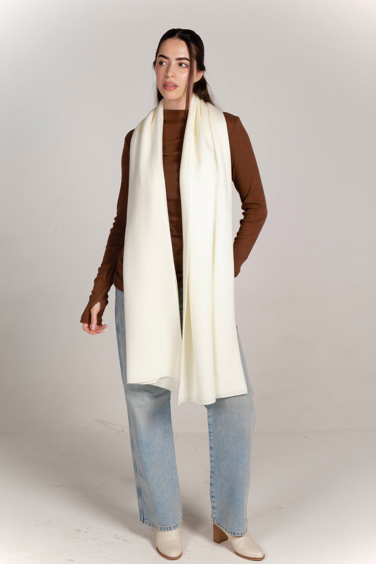 A large, soft, and beautifully draped shawl that instantly adds warmth and elegance to any outfit. Crafted from a buttery-soft knit with a subtle stretch, it’s designed to keep you extra cozy during cold days while staying effortlessly chic. Its generous size makes it a timeless layering essential — whether thrown over your shoulders, wrapped around your neck, or styled asymmetrically for a modern look.