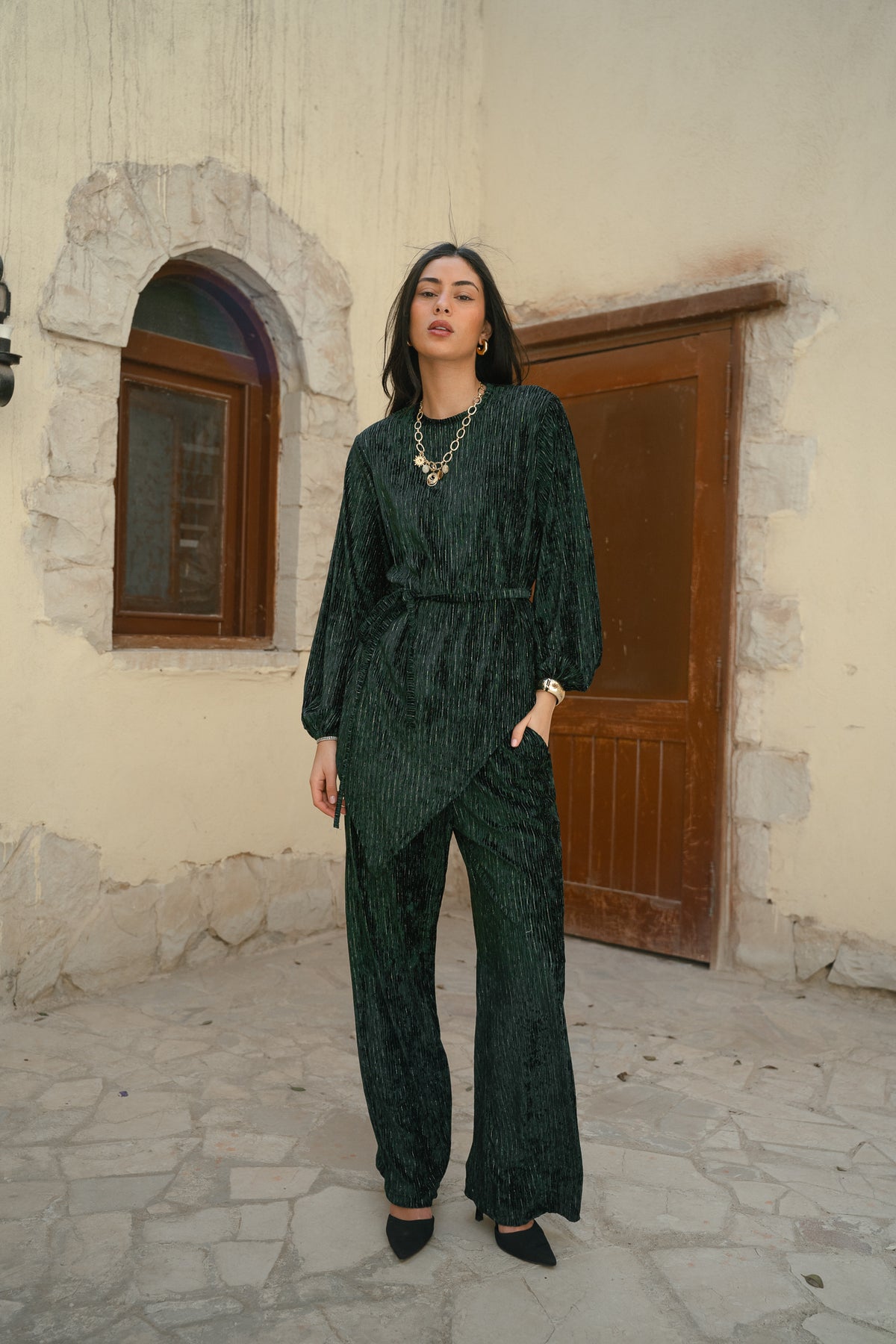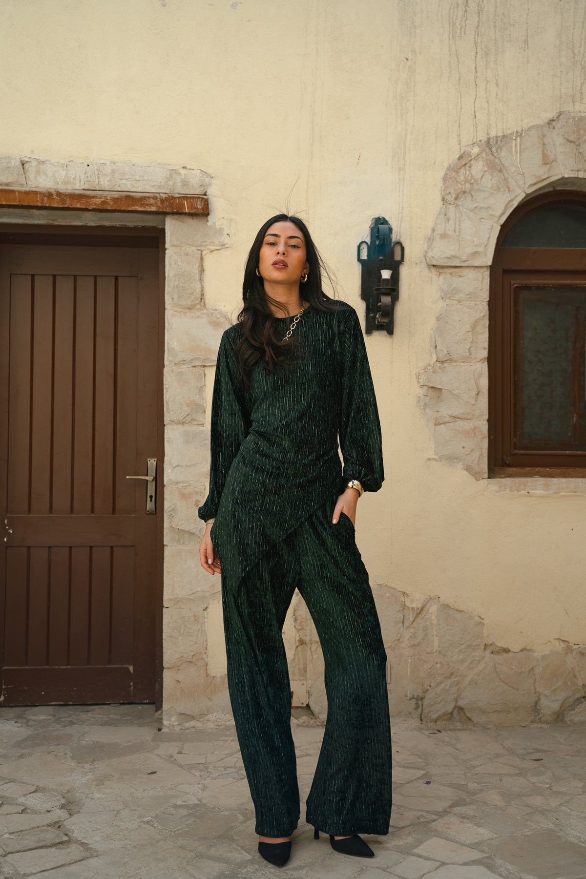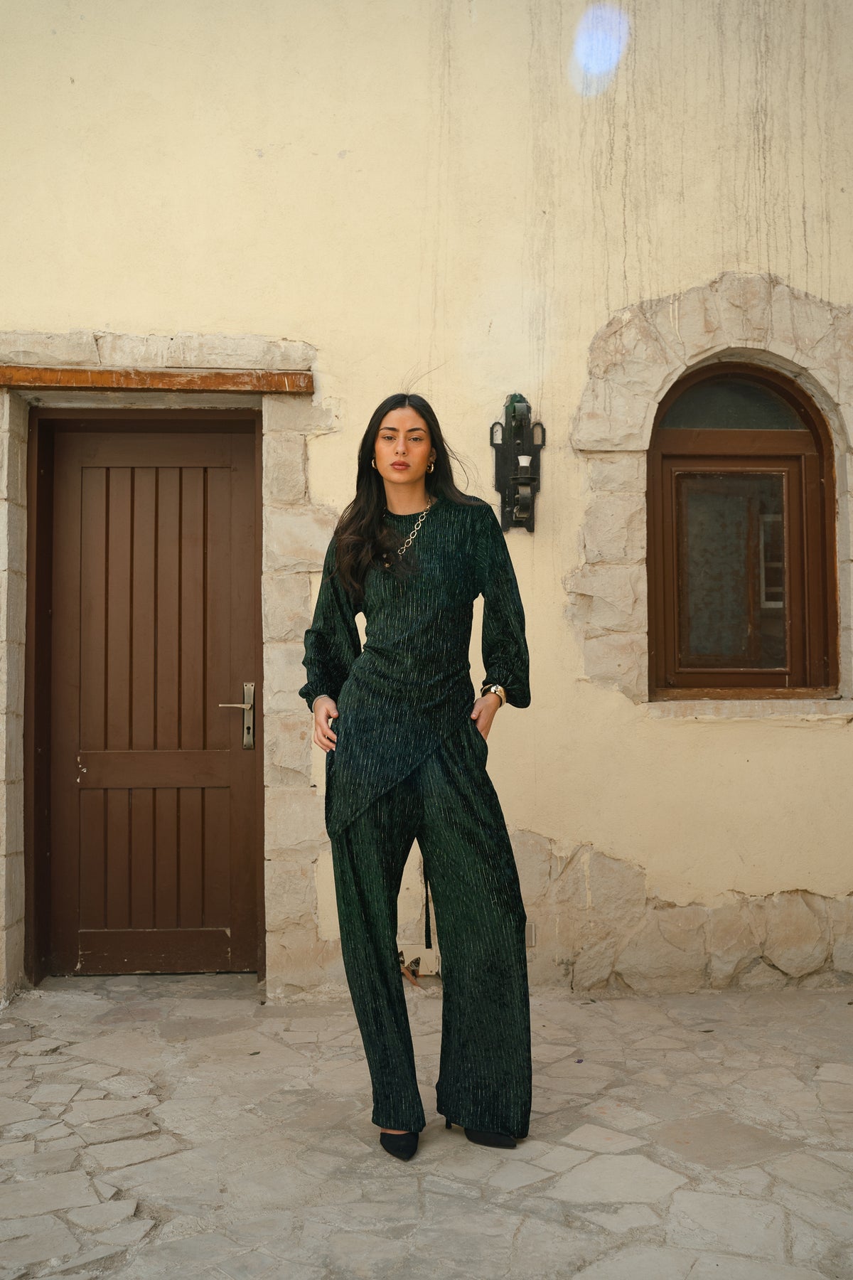Flowy wide-leg pants complete the look, making it effortlessly elegant yet comfortable. Perfect for Ramadan gatherings, dinners, and evening occasions.
