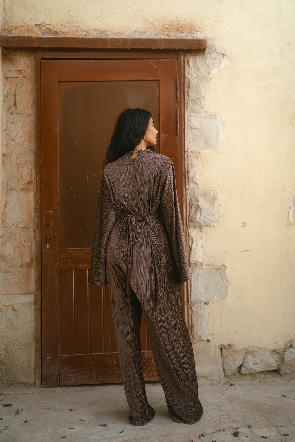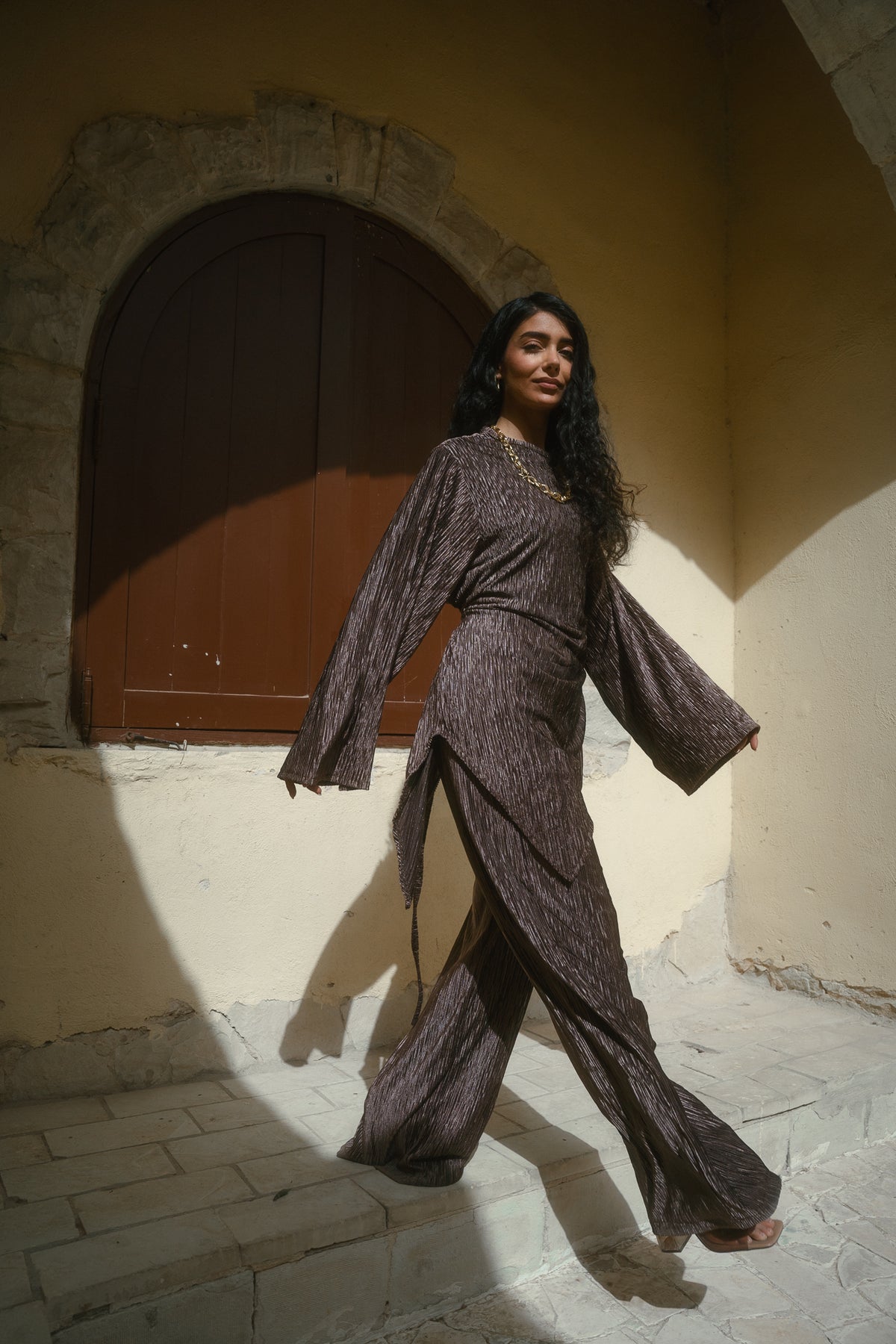 Flowy wide-leg pants complete the look, making it effortlessly elegant yet comfortable. Perfect for Ramadan gatherings, dinners, and evening occasions.