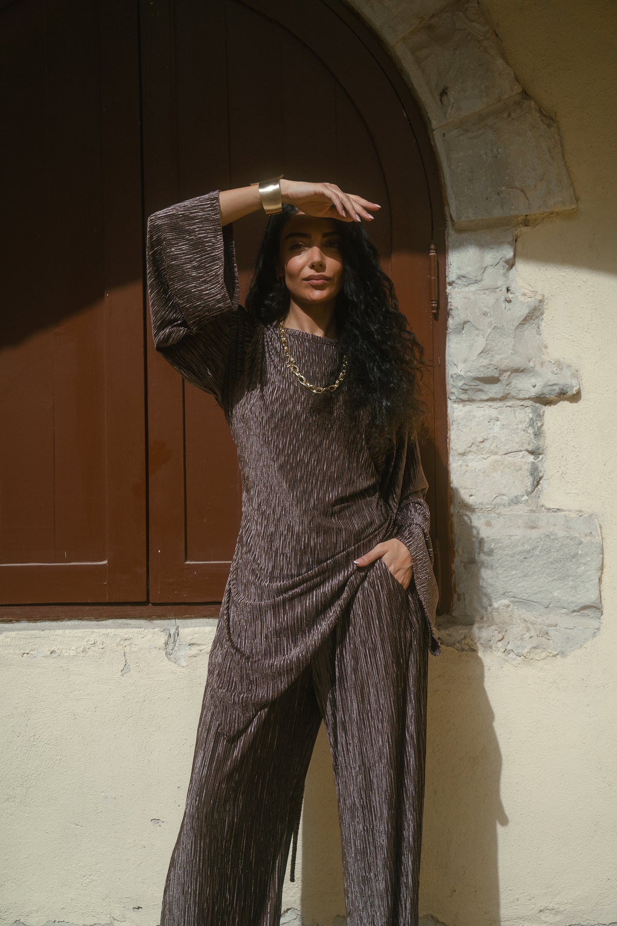 The soft pleated texture gives the body a beautiful natural shape, while the asymmetric top — longer on one side and shorter on the other — adds a modern edge.