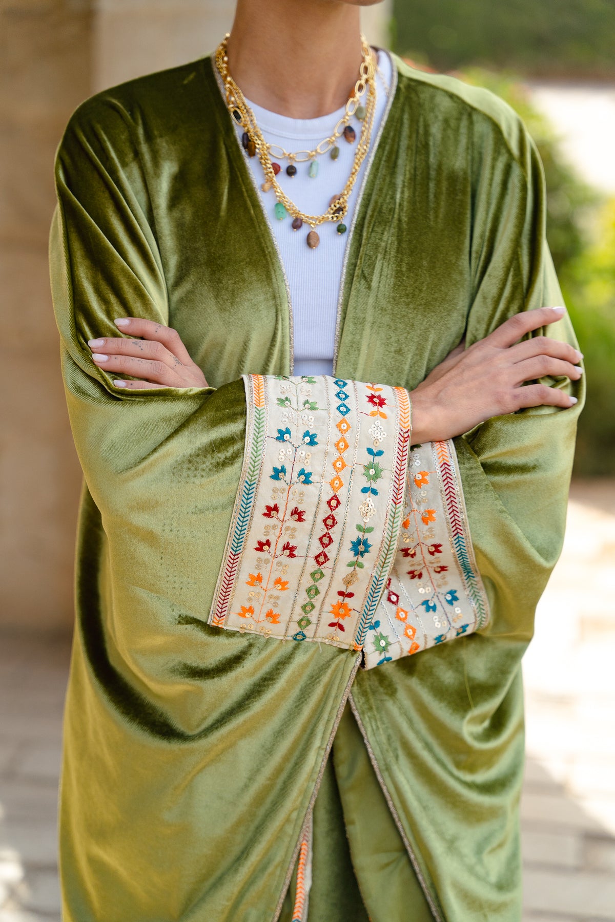 Crafted from luxurious velvet in a deep olive tone, this kaftan features intricate embroidered cuffs and detailed borders that add a vibrant artisanal touch. The flowing silhouette creates graceful movement, while the structured velvet gives it a regal presence.