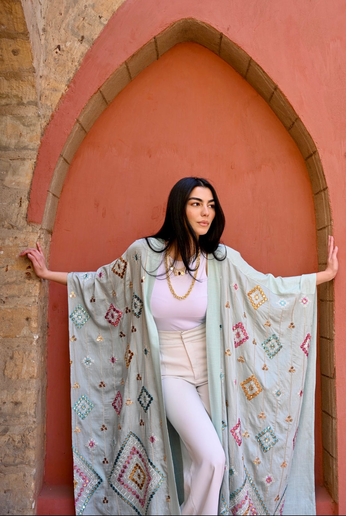 The soft structured linen gives it a graceful flow, while the colorful embroidery adds depth, artistry, and a luxurious finish. Designed to elevate any look effortlessly — perfect for Ramadan gatherings, special occasions, or elegant day styling.