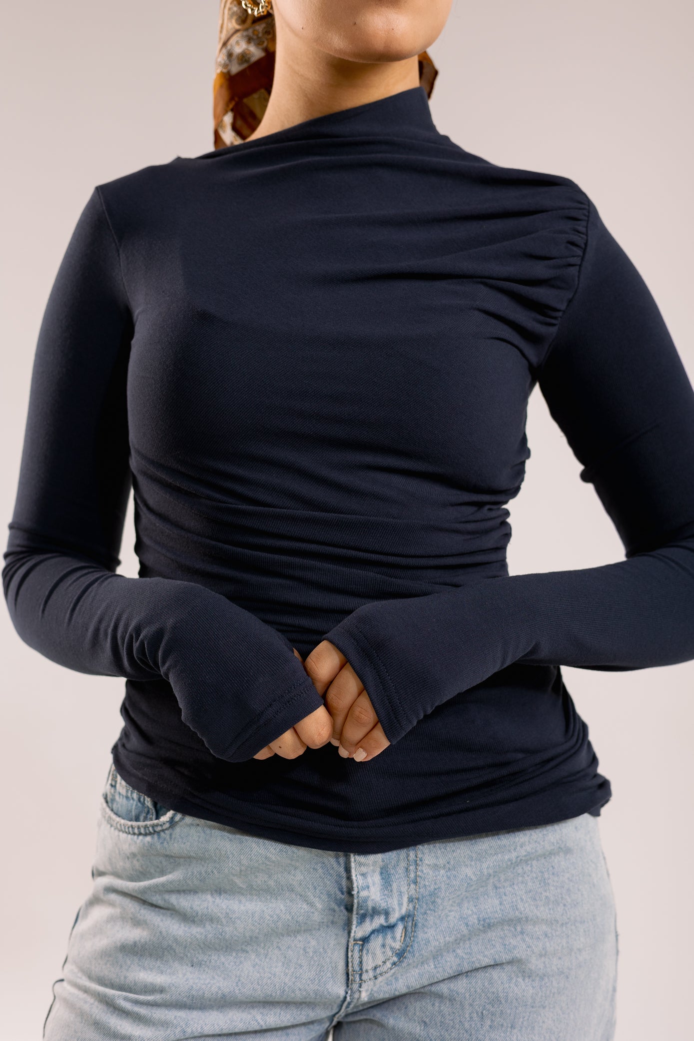 A chic long-sleeve top crafted from soft cotton with a touch of Lycra for extra comfort and stretch. Designed with elegant draping that flatters the body, a stylish neckline twist for a modern touch, and thumbhole sleeves for added ease and versatility. Perfect for elevating your everyday look with effortless sophistication.