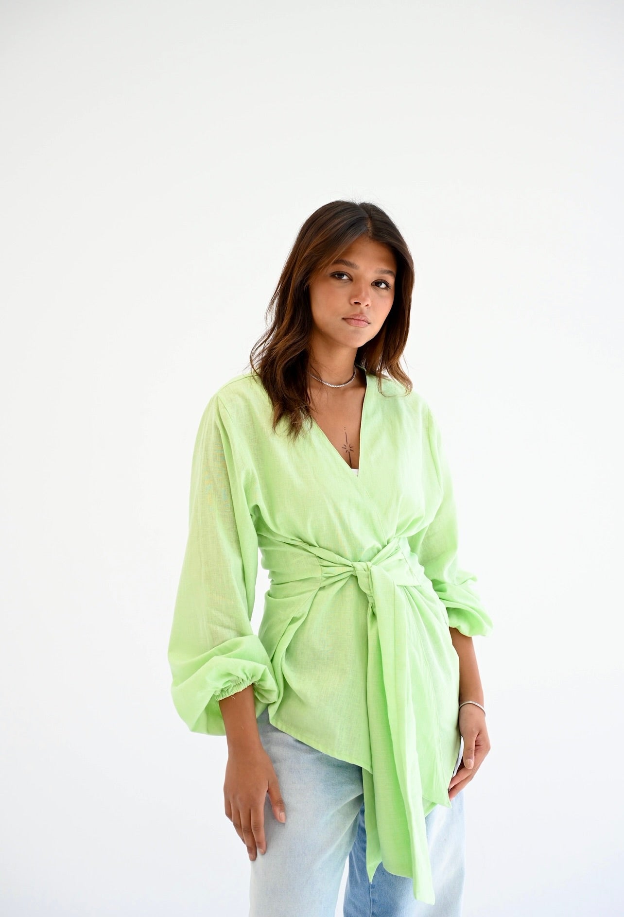 Elevate your everyday style with the Palmer Blouse, crafted from 100% natural linen for a breathable, lightweight feel. Featuring a flattering wrap design with a waist tie that defines your silhouette, and voluminous sleeves with gathered cuffs for a soft, elegant touch.