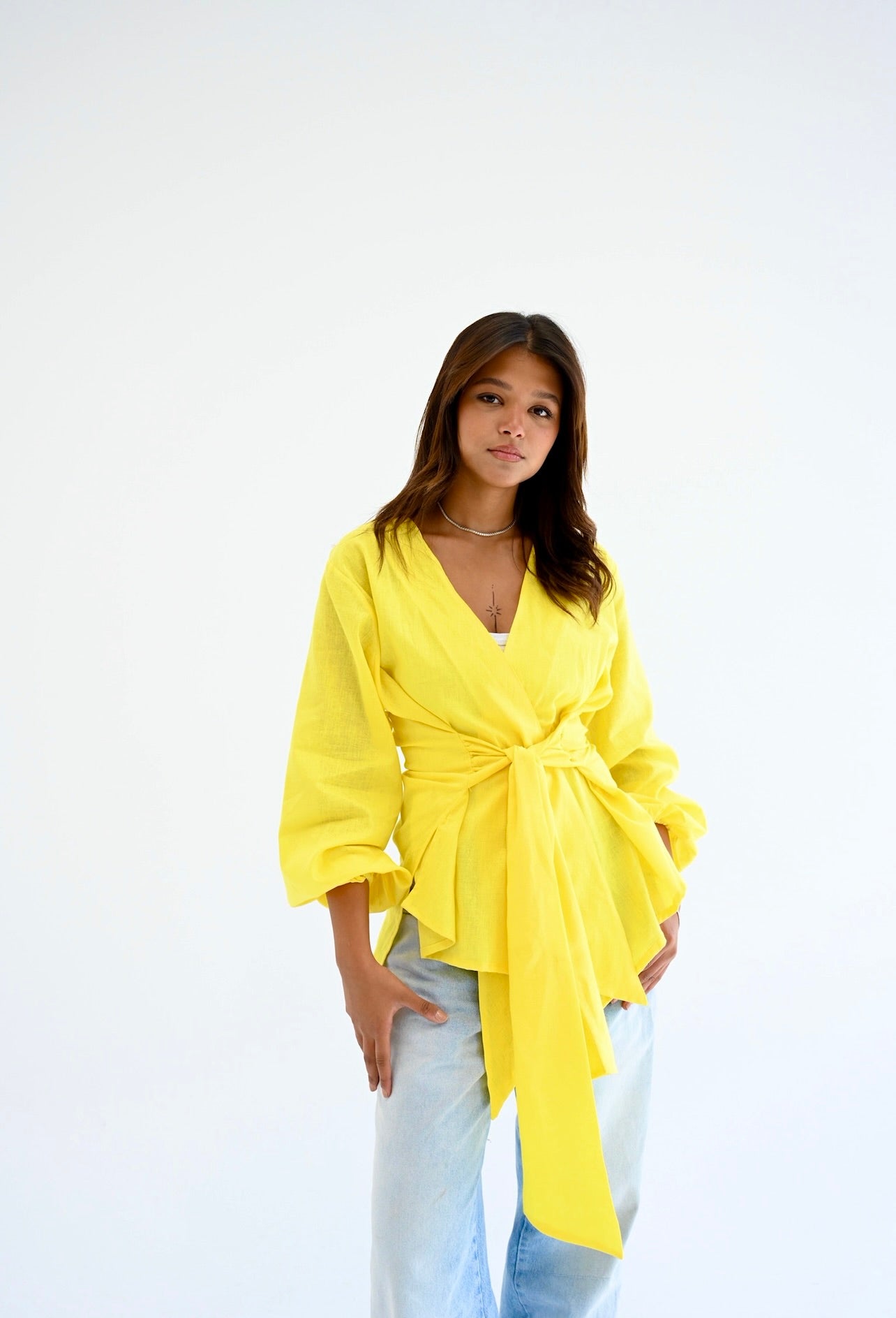 Elevate your everyday style with the Palmer Blouse, crafted from 100% natural linen for a breathable, lightweight feel. Featuring a flattering wrap design with a waist tie that defines your silhouette, and voluminous sleeves with gathered cuffs for a soft, elegant touch.