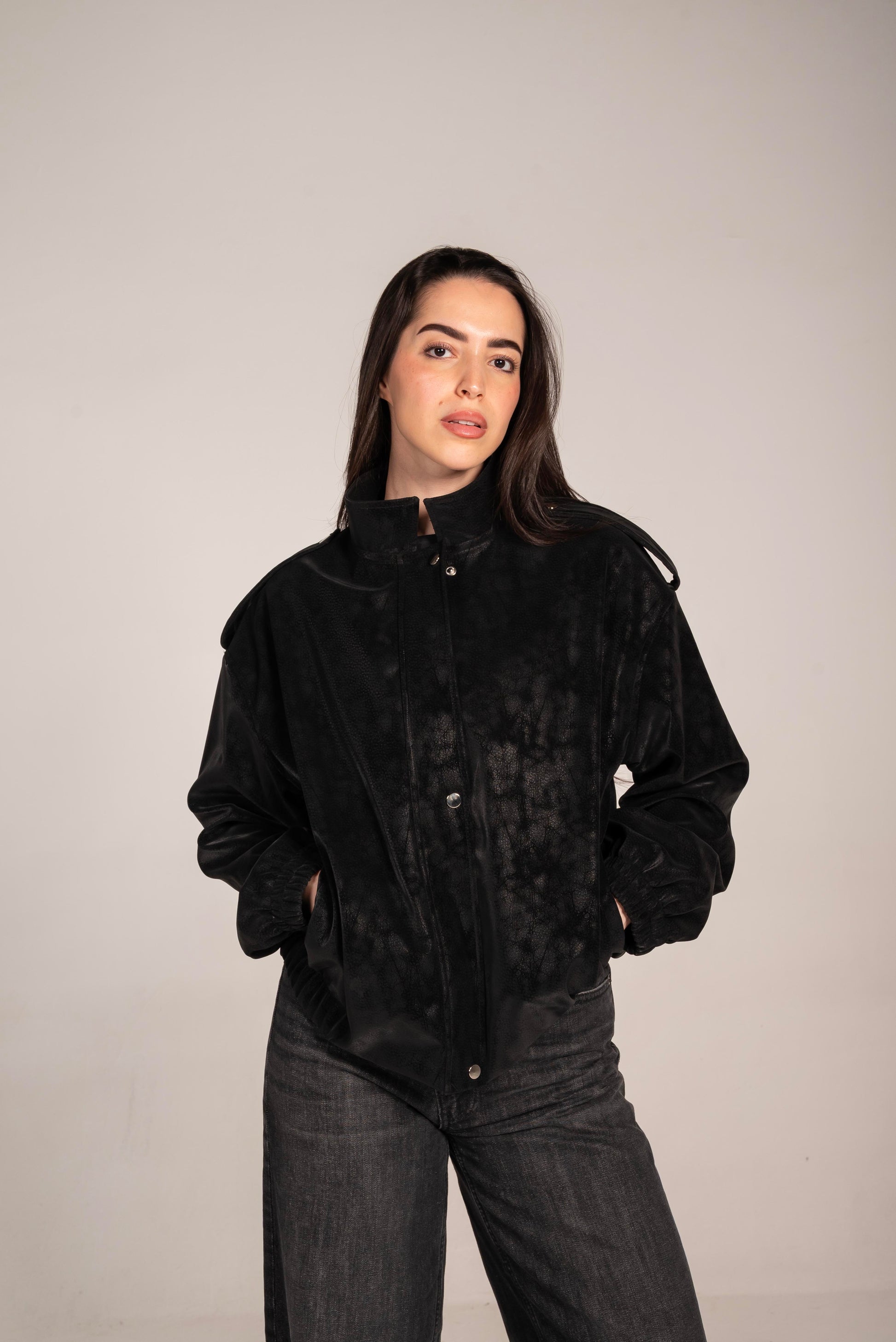 A modern faux-leather bomber with a soft suede-effect finish and a subtle glossy touch. Designed in a relaxed silhouette with a high stand collar, structured shoulders, and elastic cuffs and hem for a clean, defined shape. The Olive shade comes with a slight grey undertone, giving it a unique, elevated look.
