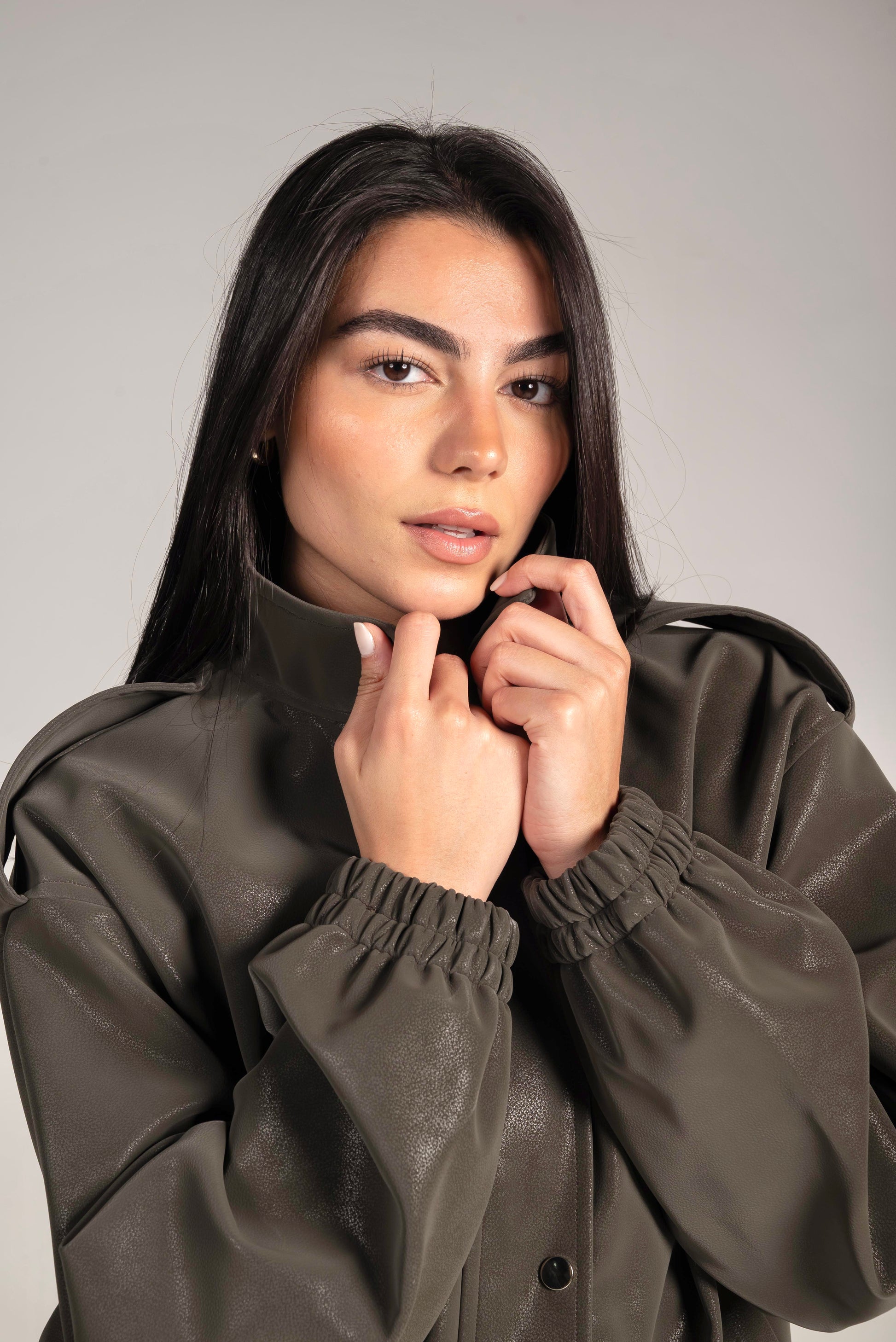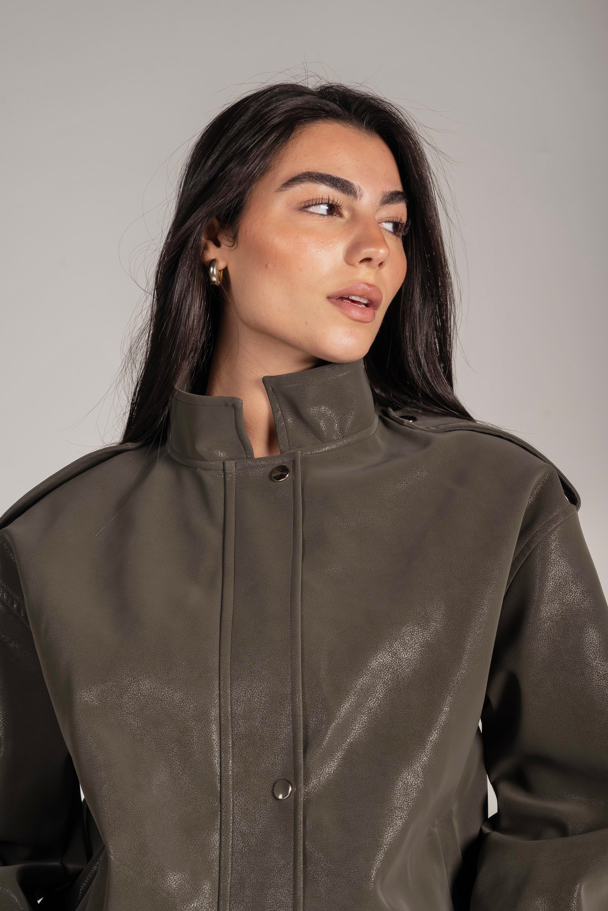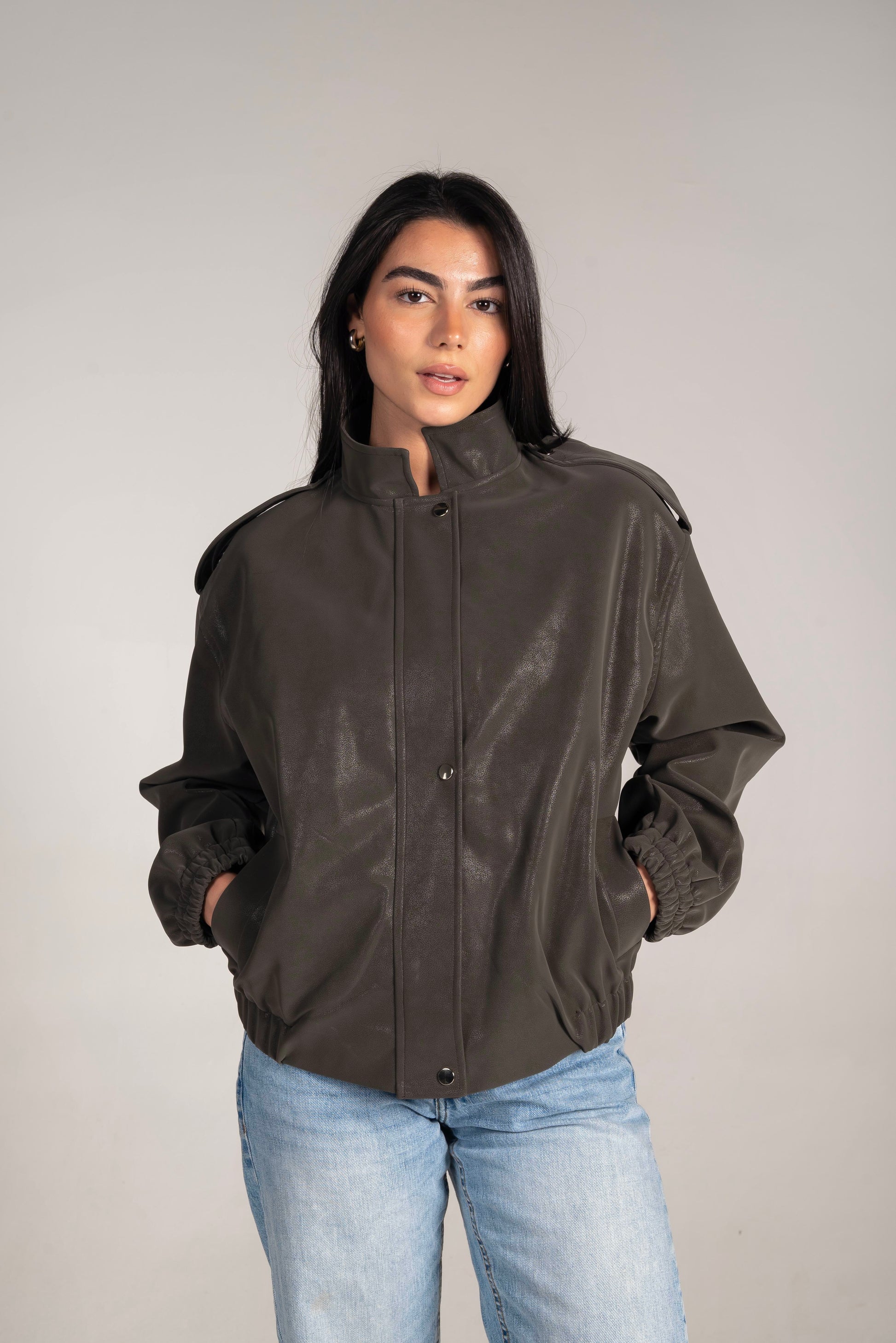 A modern faux-leather bomber with a soft suede-effect finish and a subtle glossy touch. Designed in a relaxed silhouette with a high stand collar, structured shoulders, and elastic cuffs and hem for a clean, defined shape. The Olive shade comes with a slight grey undertone, giving it a unique, elevated look.