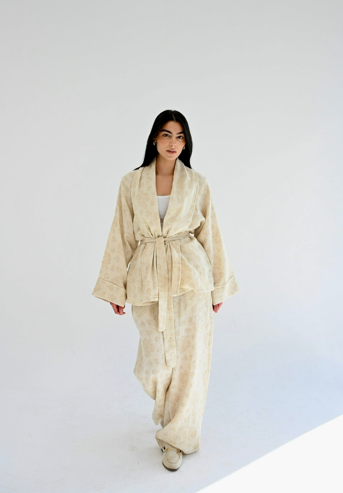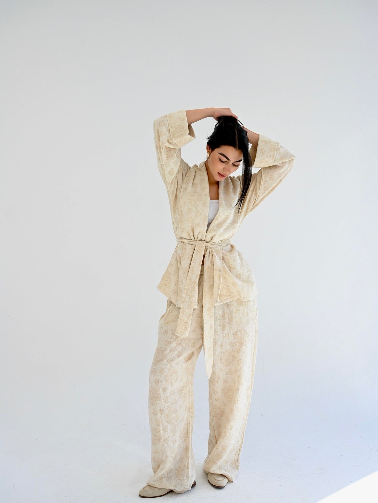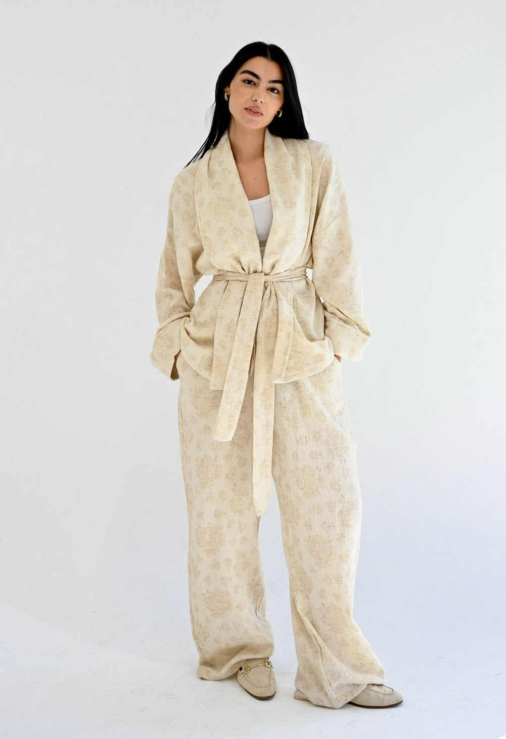 Soft, breathable, and effortlessly stylish — the Layla Textured Set is made from a unique blend of muslin and linen with a subtle woven pattern that adds depth and character. Designed with versatility in mind, each piece can be styled separately to suit your mood: pair the belted top with denim for a casual day out, or match the wide-leg pants with a crisp white shirt for an elevated look. Comfort meets timeless charm in this relaxed yet refined set.