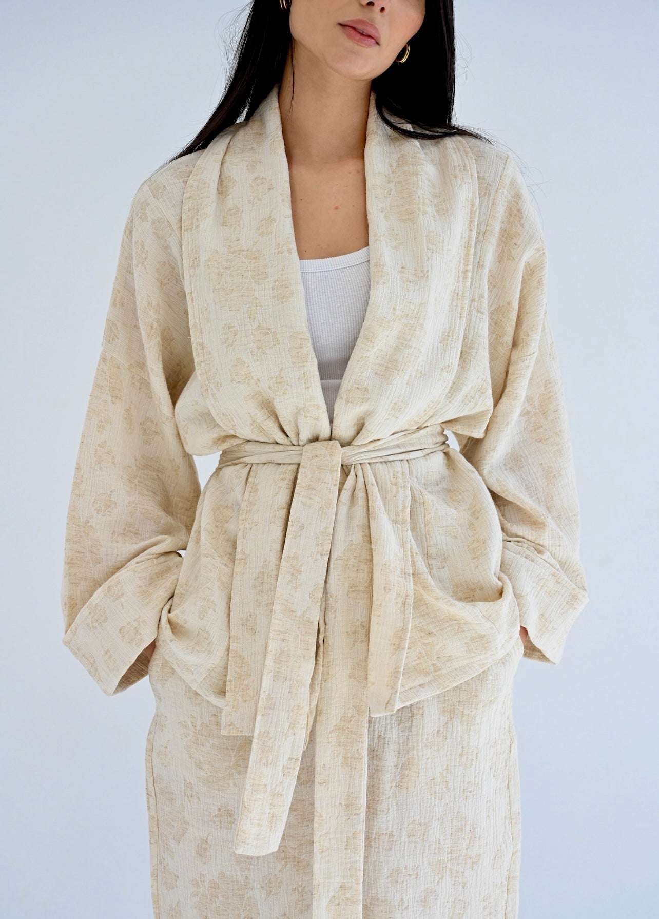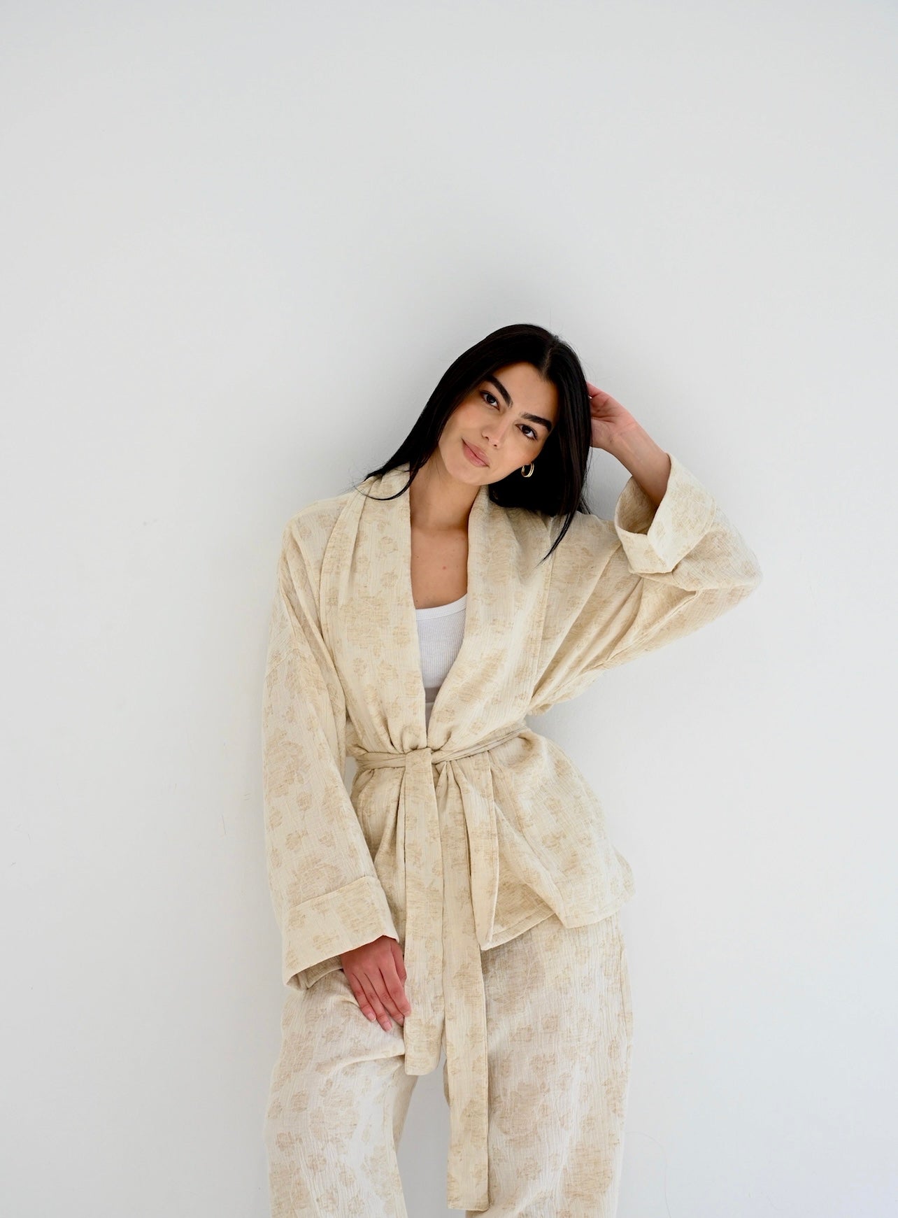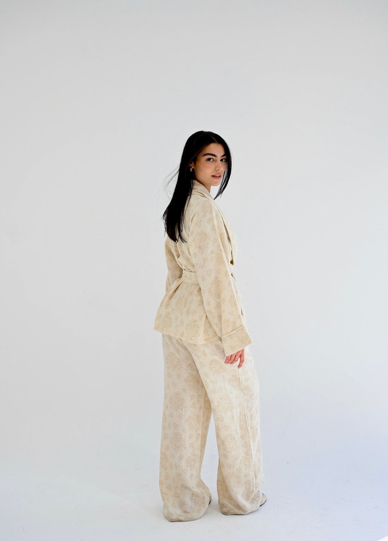 Soft, breathable, and effortlessly stylish — the Layla Textured Set is made from a unique blend of muslin and linen with a subtle woven pattern that adds depth and character. Designed with versatility in mind, each piece can be styled separately to suit your mood: pair the belted top with denim for a casual day out, or match the wide-leg pants with a crisp white shirt for an elevated look. Comfort meets timeless charm in this relaxed yet refined set.