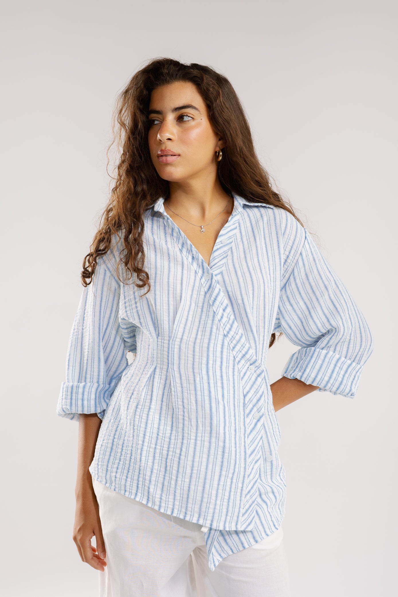 A unique striped linen-blend shirt designed with an asymmetric criss-cross front and partial button closure for a trendy, effortless vibe. It comes with a detachable back tie that cinches the waist for a corset-inspired fit, or can be worn loose for an oversized, relaxed look. This versatile piece stands out with its modern cut, flattering drape, and breathable fabric — perfect for elevating everyday outfits. Available in two colorways. Model wears size S/M.
